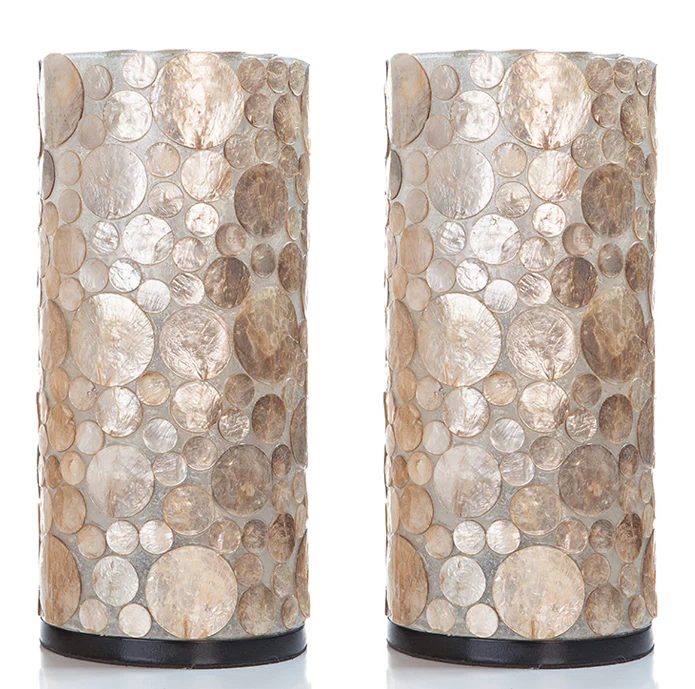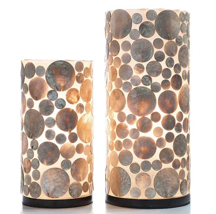 Een mooie sfeervolle lampenset gemaakt van fiberglas. De ronde capiz schelpen zijn op speelse wijze op de lamp geplakt. De schelpen zijn bruin/goud van kleur en lichten mooi op als de lampen aan staan. Verkrijgbaar in 30 en 40 cm